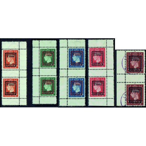 Propaganda Forgeries: Liquidation of Empire St Lucia & Singapore vertical setenant gutter pairs for five George Sixth values ½d, 1d, 1½d, 2d & 2½d on wavy line watermarked paper, all unused except 1½d which has violet CDS's, very fine group of five pairs, Michel 9 IV a / 13IV a, & 9 IVb / 13 IV b. Cat €1400. Only 400 sets made, very scarce in setenant pairs.