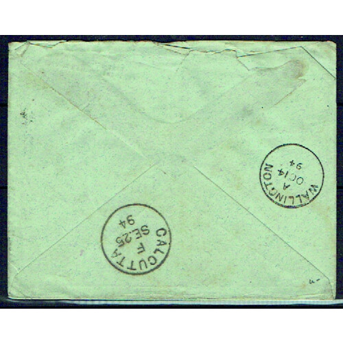 India Used in: 1894 (Sept) Cover bearing India QV 1a plum pair and ½a green trio tied RANGOON squared circle cancels, manuscript initial across all three to cancel the stamps, addr to UK. Calcutta and Wallington transit / arrival backstamps. Fine.