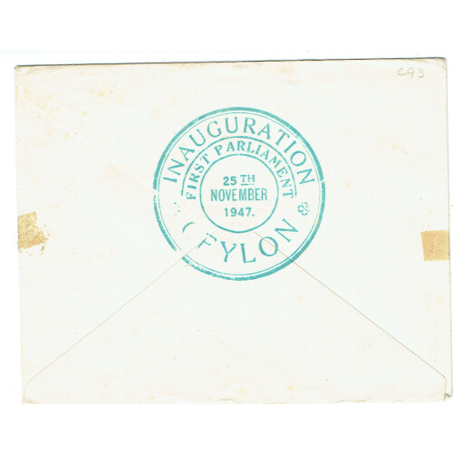 1947 (25 Nov) Inauguration of New Constitution set on typed cover to Colombo tied Colombo first day CDS cancels and NEW CONSTITUTION black and purple label affixed bottom left cancelled large INAUGURATION FIRST PARLIAMENT special cancel in greenish blue. Few light tones.