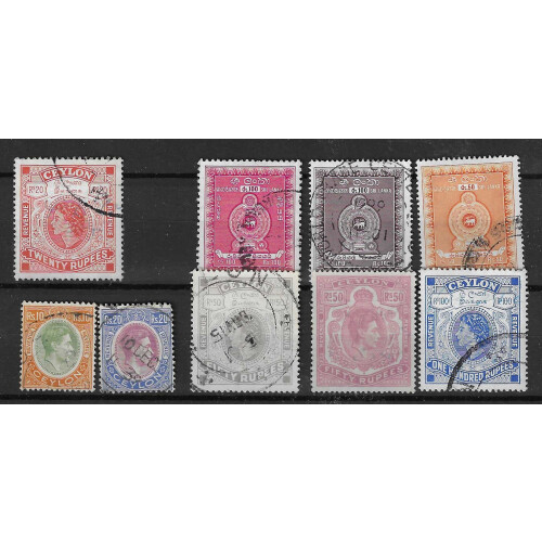 Revenue: 1938-1984 useful group of high values used including 1938 GVI 10r & 20r, 50r mauve and purple, 1954 QEII 20r orange, 50r brown (pin hole), 100r blue, then few later to 100r brown or dark red. Nice group. (11). Barefoot 8/10, 16/18, 29 & 33.