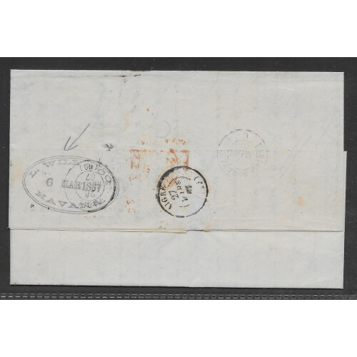 1867 Entire letter from Havana to France via New York written in French bearing 8 chargemark in manuscript. New York CDS in black and SERV BRIT CALAIS ET UNIS CDS in red plus various backstamps. Single horizontal filing mark otherwise very fine.