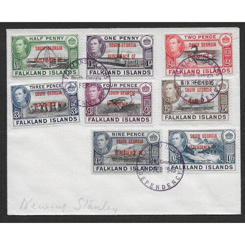 South Georgia: 1945 (21 Feb) Complete set of 8 overprint values to 1s neatly tied violet FALKLAND ISLANDS DEPENDENCY / South Georgia CDS cancels, PORT STANLEY receiver on reverse, fine. SG B1/8.