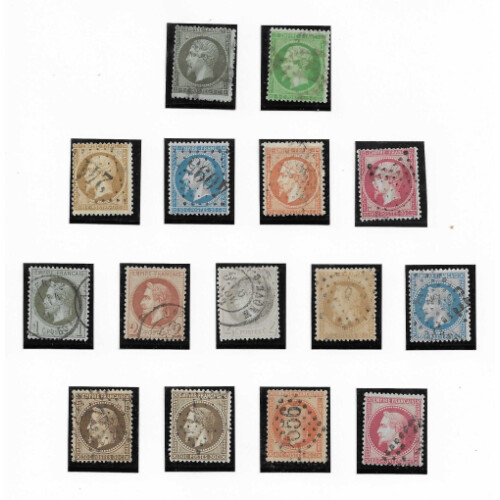 1849-1876 Attractive mainly fine used collection for different printings on three Safe album leaves noted 1850 10c bistre (3 margins Cat £400), 20c black, 25c blue, 40c orange (4 margins with tear cat £600), 1fr forgery, 1852 Repub 25c blue Napoleon, 1852-70 10c brown (nice 4 margins), 5c green, 10c bistre yellow, 20c blue, 40c orange (2 shades), 80c & 1fr (taken as reprint looks nice f.u.), 1862 perf 'set' to 80c, 1863-70 perf Napoleon good run 1c to 80c (15 values), 1869 5fr lilac-grey fine used appearance (heavy thinning cat £1300), 1870-71 Ceres imperf 1c (unused), 2c (Cat £325, thinned), 5c, 10c (2 shades), 20c blue (2), 80c rose (4 margins), 1871-76 perf issues 'set' to 80c, attractive lot with high cat values. (53).