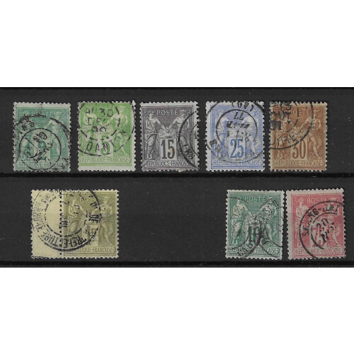 1876-85 Complete set of 8 N under U printing all fine used CDS, odd perf fault but mainly fine, 1f has prefecture Cotes Du Rhone CDS left margin single, mainly fine, SG 225/242 (8).