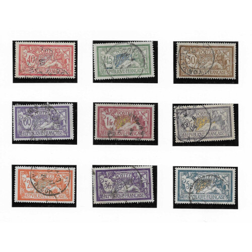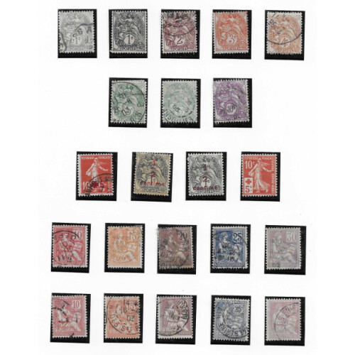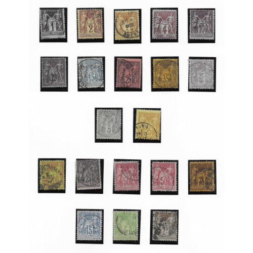 1877-1937 Collection of mint and used sets for different printings on plain Safe album leaves noted 1877-90 to 5f lilac (Cat £330+), 1918 Red Cross mint (Cat £160), 1928 Air Forgeries pair used (Cat £18,500 as genuine), Olivier & Merson to 20f, Precancels precancels 1922-47 mainly mint, 1927 Air set 2 mint (ovpts taken 'as is), Sinking Funds mint or used, 1929 Expo ovpt forged 2fr (Cat £1000 genuine), 1937 Museums set used (Cat £120), 1936 100th Flight 10f used (Cat £180), etc. Very attractive lot with high cat value. (c275).