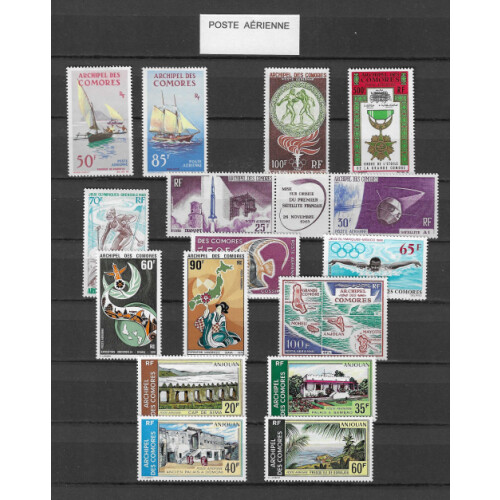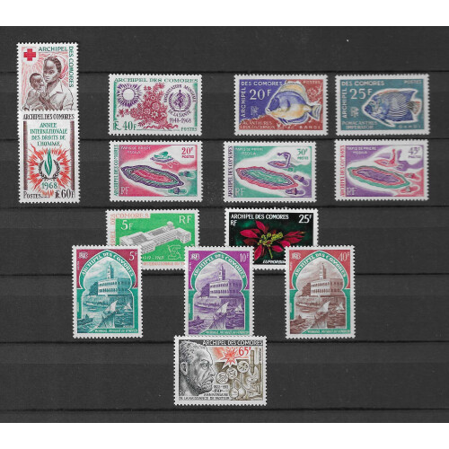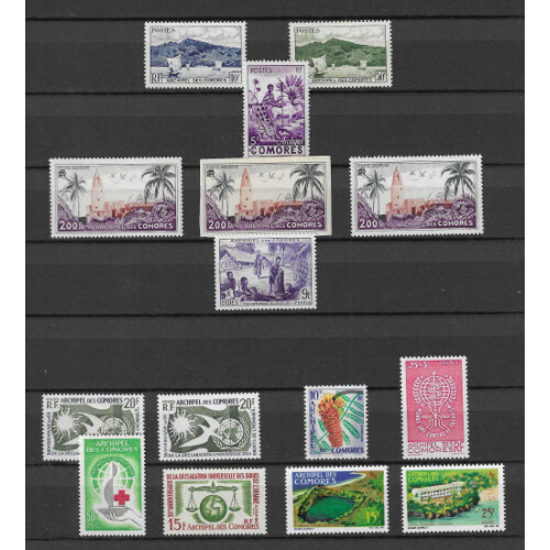 Comoro Islands: Mint and unmounted mint range on stockpage includes postage and airs sets and ranges, 1950 200f air both perf and imperf (Cat £76), 1958 Human Rights, 1963 Human Rights, 1963 Red X, 1972 Pasteur, 1975 Folk Dances set 2 U/M (Cat £340), 1964 Ait Star air, 1966 views air 200f in mint blk of 8, attractive clean lot. Good cat value. (57).
