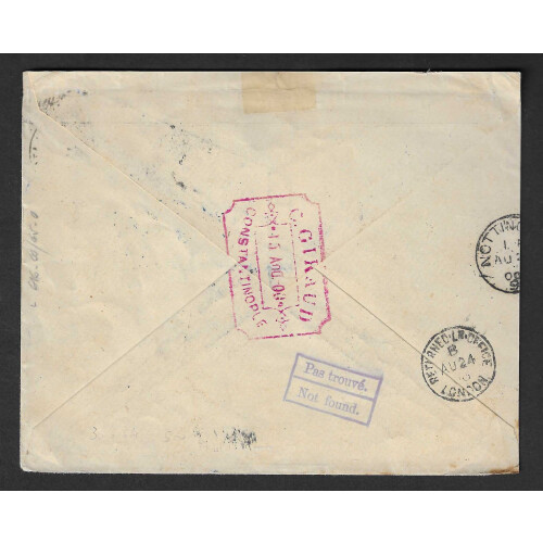 Post Offices in Turkish Empire: 1900 Envelope for O. GIRAUD CONSTANTINOPLE to Nottingham UK bearing 1piastre on 25c black on rose (SG4) tied with CONSTANTINOPLE GALATIA TURQUIE dated cds with a further two cds's of the same; then a plethora of transit markings with RETOUR / A L'ENVOYEUR H/S in blue, boxed NOT TO BE FOUND in red and RETURNED LETTER BRANCH NOTTINGHAM cds in black on the front and RETURNED LR OFFICE LONDON cds in black and PAS TROUVE / NOT FOUND in violet on the reverse. A very small 3mm repair at the top does not detract from this very striking item.
