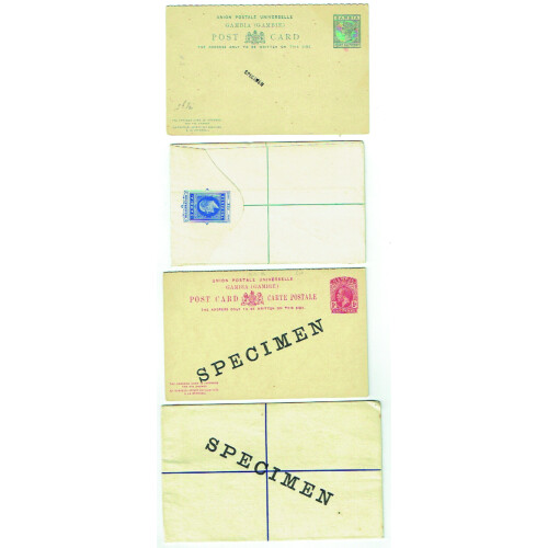 SPECIMEN Overprints on eight Queen Victoria reply card, registered P/S env. Includes QV 1d red Reply card, 1d red single card, 1½d grey with very small SPECIMEN in black (rare type), EDVII 1d single card, 2d blue registered env., GV 1d red reply card, 1d red single card & 1½d blue registered env. each with SPECIMEN diagonally across the centre in black on both sides. Nice group of 8 Specimen items.