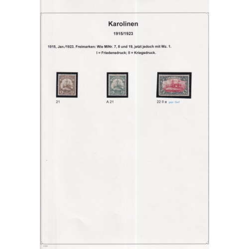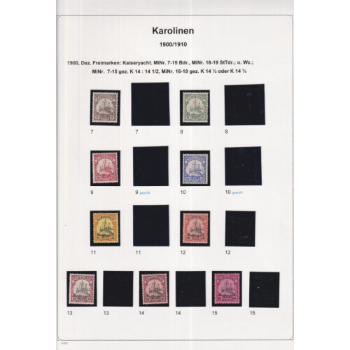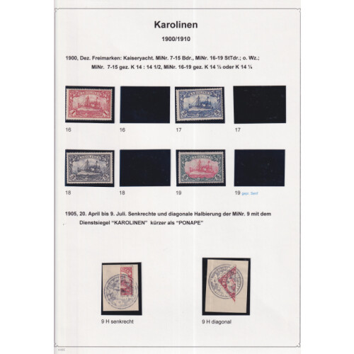 Caroline Islands: Attractive collection neatly laid out on leaves identified in Michel order mint and used with better throughout including 1899 (48 degree) 10pf mint (Cat €75), 20pf mint (Cat €75), 1900 (56 degree) 3pf, 5pf, 10pf & 20pf used, 25pf & 50pf mint, 1900 Yachts set 13 mint (Cat €250), 1905 PONAPE negative seal on vertical or diagonallly bisected 10pf red on paper (Cat €140), 1915 Yacht set 3 mint (Cat €60), mainly fine (29).