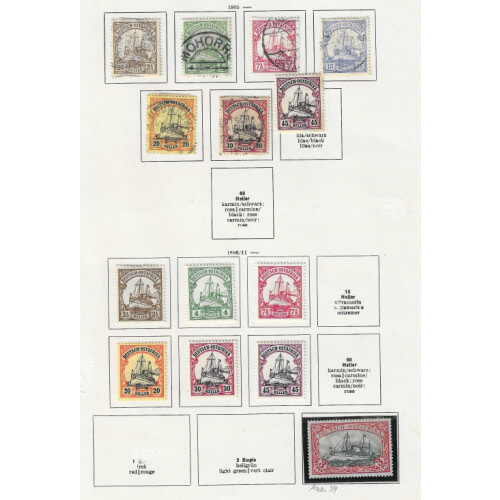 East Africa: Two old time pages with useful assembly of 26 stamps mint & used, 1890-99 3p on 5pf green mint (expertised on reverse, cat £75), 10p on 20pf part o.g. hinged and expertised (Cat £48), 1896-99 25p on 50pf used, 1901 no wmk 2r green mint, 1905-20 7 vals incl 3r black and red mint (Cat £55). (26).