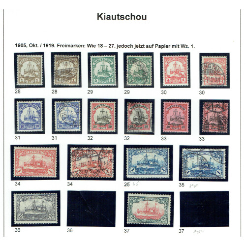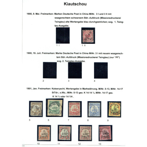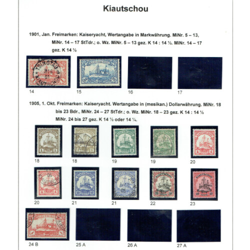 Kiautschou: Attractive collection neatly laid out on leaves identified in Michel order mint and used with better throughout including 1900 5Pfg on 10pf red with 56 degree overprint (Michel 1 II cat €65), 1901 Yacht set to 1m used (Cat €383), 2m blue mint, 1905 Yachts no wmk m & u to ½d CDS (Cat €393), 1905 Wmk Lozenges to $1 used (Cat €275), set 10 mint (Cat €80), plus 1912 PPC with 4c red tied TSINGTAU CDS, mainly fine (41).