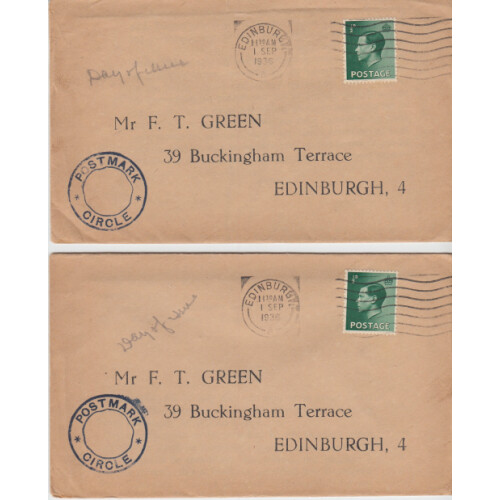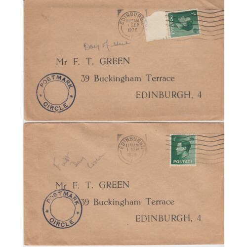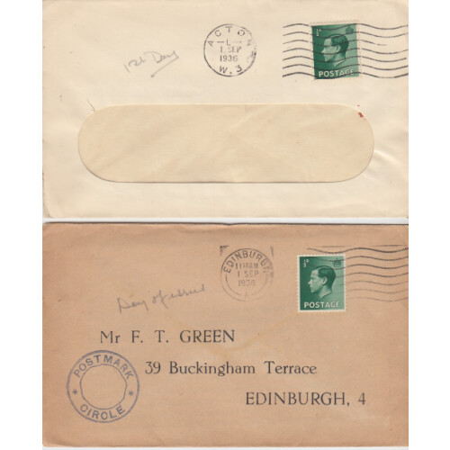 Twelve 1 Sept 1936 cancels on typed first covers with King Edward VIII ½d greens ten with Postmark Circle cachet.