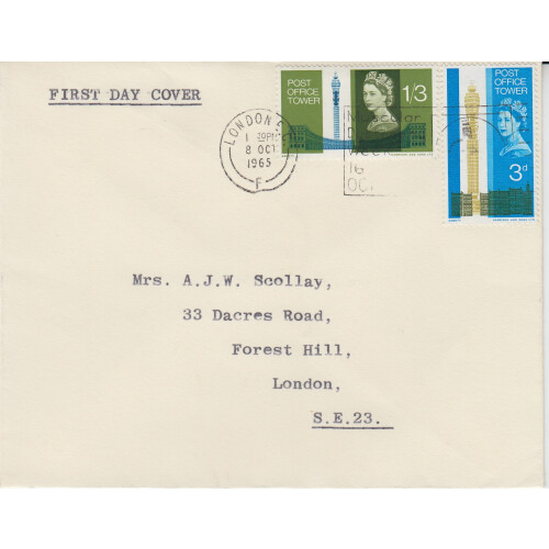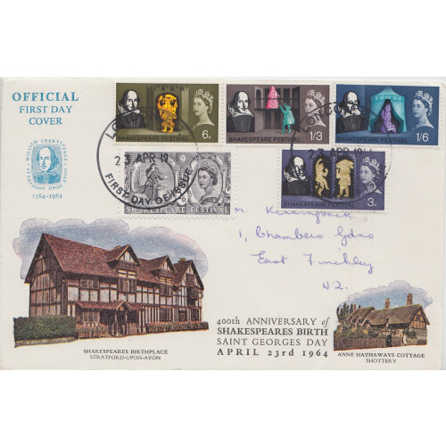 1965 International Telecoms ordinary first day cover. SG 683-684 plus 1965 typed Post Office tower first day cover. SG 679-680 Plus 1964 Geographical FDC. SG 651-654 and 1964 Shakespeare Festival FDC. SG 646-650. (4).