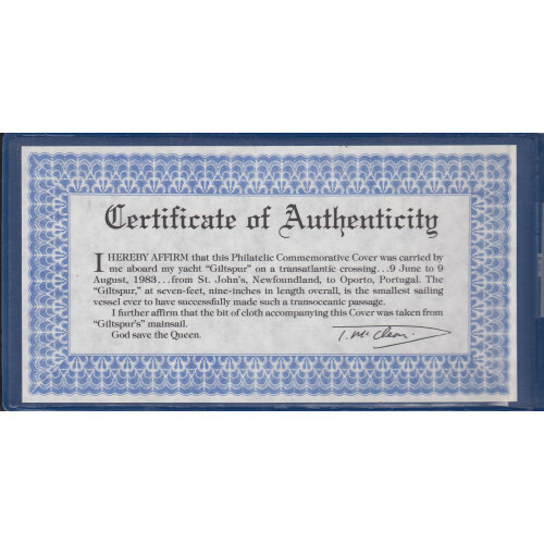 1983 Philatelic Commemorative Cover carried on yacht Giltsput from St. John's Newfoundland to Oporto Portugal with signature of Tom McClean.