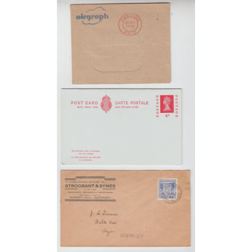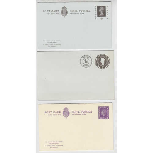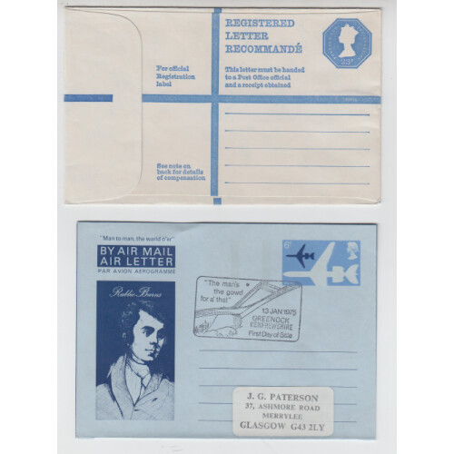 A selection of ten Queen Elizabeth II postal stationery including reply cards and postcards. Plus eight 1975 used Robert Burns air letters and six QEII 1950's covers.