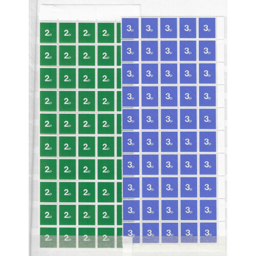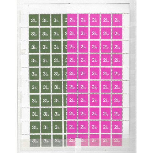 Post Office Training stamps: 1970s large mint blocks for a variety of values comprises 2p green (115 incl two panes of 50), 2½p magenta (115), 3p ultramarine (115), 3½p bronze-green (115), 4p ochre (115). Mainly fine. (575).