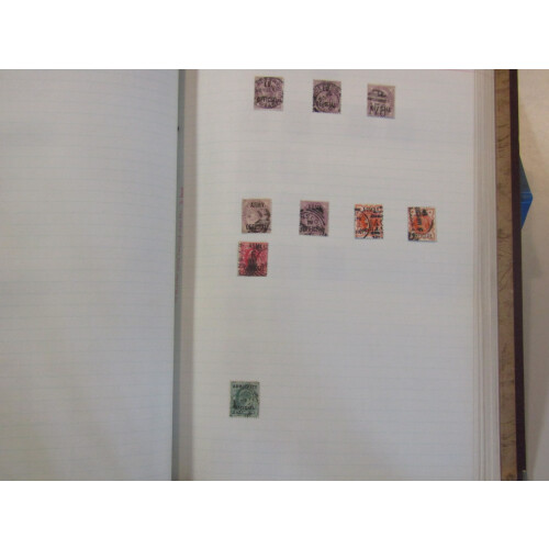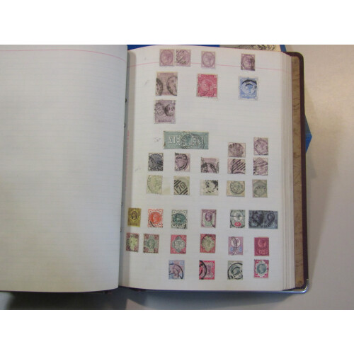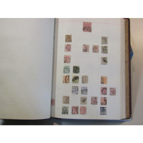 OLD TIME Ledger album with useful 1840 to modern noted 1840 1d black (no margins), 1854 2d blue with arc postmark and numeral, 1858 2d blue with K in circle cancel, 1856 4d, 6d & 1s, 1862 3d, 4d, 6d & 1s, 1865 3d, 4d, 6d, 9d bistre pl.4, 1s pl.4, 1873 6d grey (SG 125 Cat £300) good used, 1876 8d orange sound used (Cat £350), 1891 £1 green used with red ink marks (Cat £800), 1883 9d green CDS (toned), 2/6, 5s, 10s, EDVII 2/6 (2 one with Vico St CDS), 5s carmine (2), 10s ultramarine CDS used, £1 blue-green with Registered WDO oval cancels (Cat £825), Seahorses GV 2/6 yellow-brown (faults), 1915 DLR 10s blue (Cat £875), GVI high values, QEII commems used, useful catalogue value. 100s.