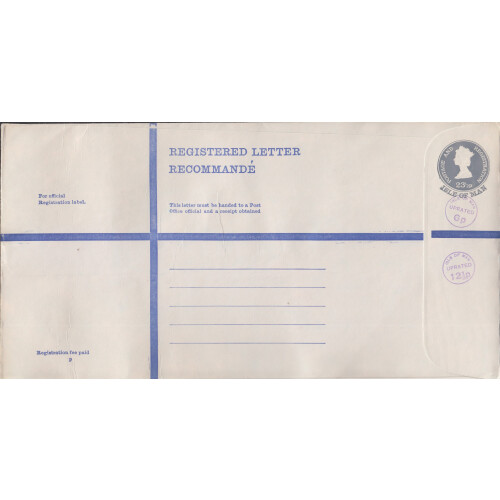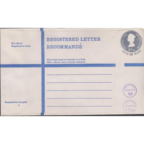 Registered postal stationery envelopes large and medium sizes with uprated cancels 1975 CTO including G (2), H (2) & K sizes Uprated 6p & 12½p in violet. Fine (5).