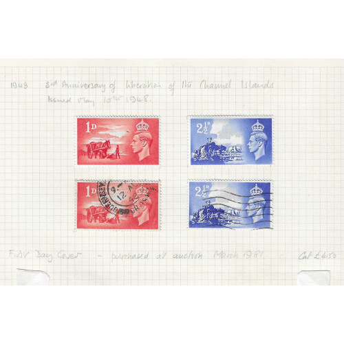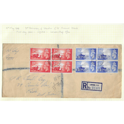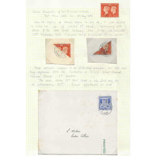 1940-45 Stamp Centenary 2d orange two bisects on paper (one with crayon line), 1944 (12 Apr) cut down card with 2½d ultr. tied FDI CDS (few tones), 1945 Cover with ½d, 1d & 2½d tied 16th June wavy line machine cancel (tone spotting), then Anniversary of Liberation set of two in blks of 4 on regd cover to UK tied 10th May 1948. Nice little group.