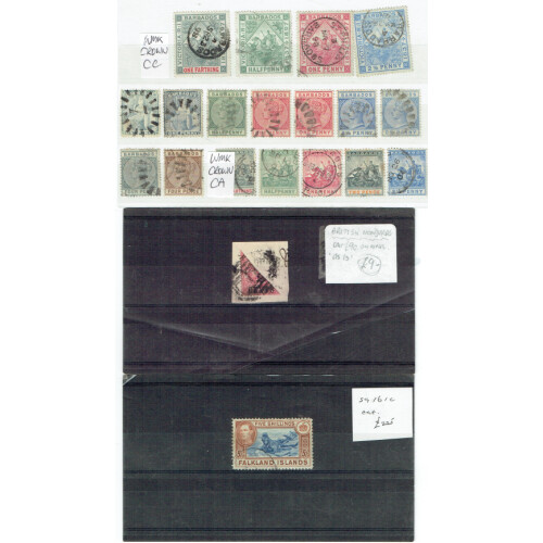 British Commonwealth interesting small accumulation on stockcards, in packets, loose QV to modern with better seen throughout, very mixed mint, unused and used noted N. Rhodesia GV to 5s used, small selection of 1935 SJ sets, Antigua 1886 1s used (Cat £150), Br. Honduras bisect on paper, HK to $50 U/M, India, Ceylon, Gold Coast 1901 1d on 6d mint blk of 4, Jamaica, Falkland Is. GVI 5s used (faults), etc, 100s.