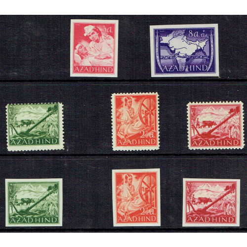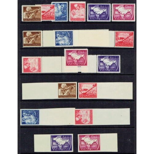 1943 Azad Hind - Free India German WWII issue for India, assembly of marginal mint low values imperf and perf including 1r black, orange and green imperf u/m single expertised HBo & FD on reverse. Very fine. Produced by the Indian National Army for post liberation of India but never issued. (27).