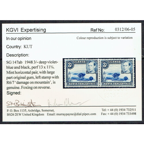 1948 (August) 3s dull ultramarine and black horizontal pair mounted mint with left stamp showing Damage on mountain variety, light tone spot otherwise very fine, very scarce variety, SG 147ab. Complete with KGVI Expertising Certificate