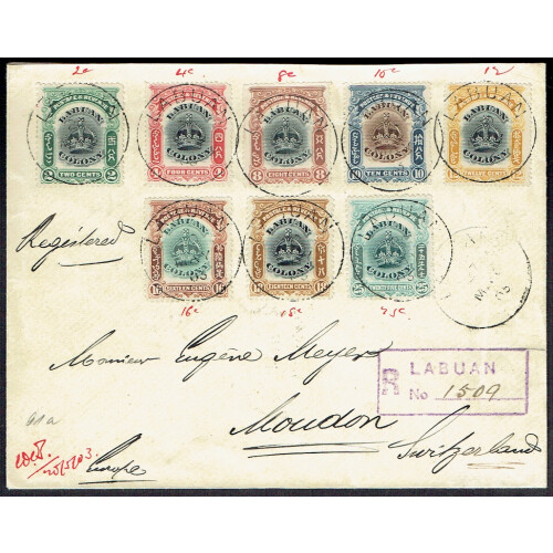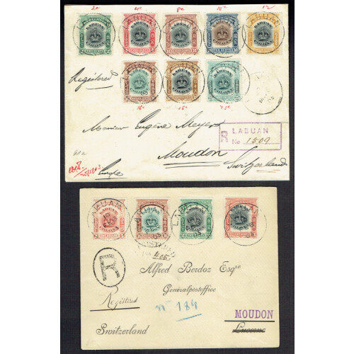 1903 Two philatelic covers bearing the 1902-03 Crown definitive set of 12 to $1 sent in February or May of 1903 to the same address in Switzerland tied LABUAN cds cancels, both registered and very fine. SG 117/128. Used set cat £275. Cat x30 for commercially used £8250. Most desireable pair. (2).