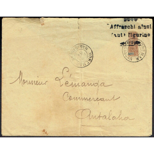 1904 Provisionals: 1904 (9 Feb) Tatty over sent Vonemar to Antalaha bearing vertically bisected 30c cinnamon tied by three line Affranchi ainsi/ faute figurine handstamp in black and tied VONEMAR cds cancel in black, vertical fold and faults, scarce. SG 52w. Cat £900.