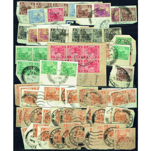 Postmarks: Federated Malay States 1922-34 Tiger defins on paper mainly low values some in nice combinations with good range of postmarks in amongst mainly KUALA LUMPUR noted PARIT, TELUK ANSON, BATU GAJAH, BRUAS, JELEBU, TAIPING, KLANG, SEREMBA, IPOH, PORT DICKSON, KAMPAR, MATANG, ETC, Approx 125.