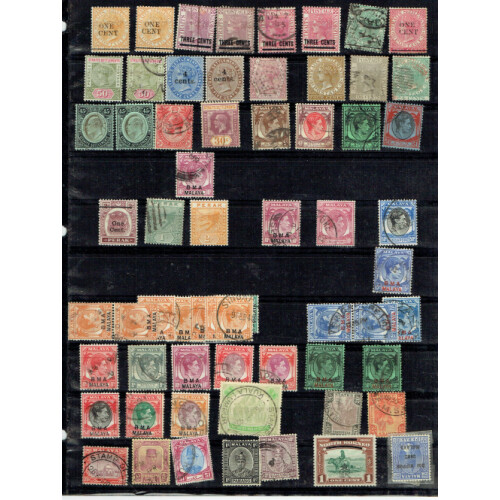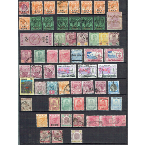 Small jumbled ranges QV to modern on stockpages and album leaves, m & u, incl Straits Sett. QV surcharges mint, used, Perak Tiger defins to 5c, Singapore GVI to $5, QEII to $5, Johore mint to $1, used to $5, BMA Malaya, FMS Leaping Tiger good mint and used range to $2, nice little lot.