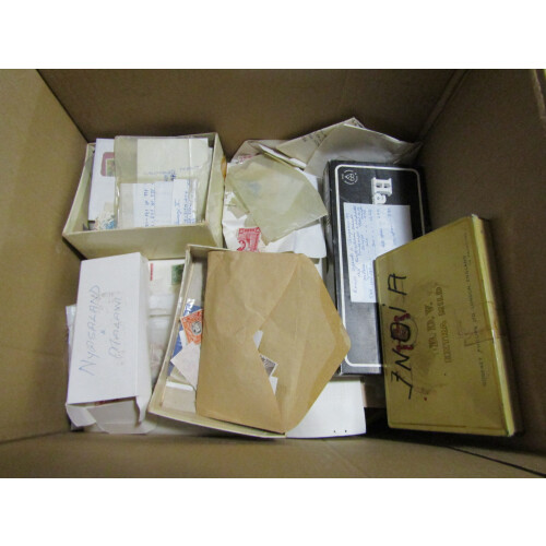 Accumulation in carton with worldwide all periods mint and used incl mint and used on stockpages, leaves, loose incl S. Africa mint plate blocks, Transkei sheetlets from 1981, Australia 1992 year book, Australia P/Packs, USA 1996 Atlanta sheetlet, Russia 1980s U/M, Kenya bundleware for defins (1000s) plus Br. Africa duplicated in envelopes, World Ideal Album very sparse but in good condition, loose in packets etc, plenty to sort here, 1000s.