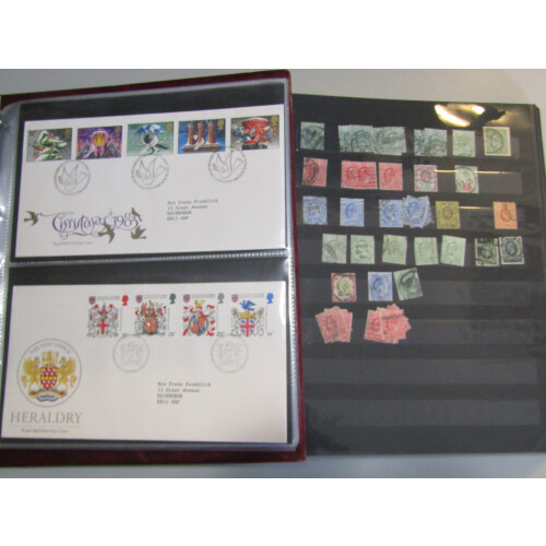 Balance of a consignment mainly GB in albums and cover binders noted some face material, FDCs incl 1952 Coronation illus., 1989-1997 & 1998-2003 in Royal Mail albums, foreign covers early to modern, Switzerland extras in small stockbook & binder etc, 100s. 2 Boxes.
