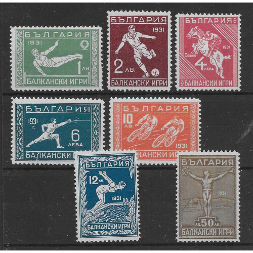 1931 Balkan Olympic Games seven different values mainly unmounted mint, includes 6l green (printing flaw on bottom inscription), 10l orange (mounted mint, cat £42), 12l dark blue (cat £130) & 50l brown (cat £140), fine, SG range 309/315, Cat £350. (7).