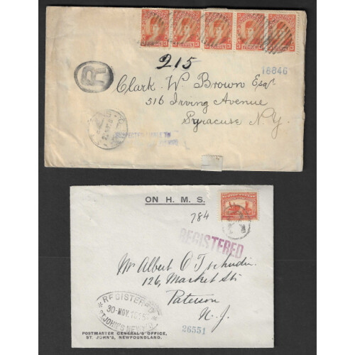 Newfoundland: 1898-1915 Group of three Registered covers with better frankings and combinations noted 1898 15c triple weight to USA 3c orange strip of 5 with SUSPECTED LIABLE TO POSTAGE DUE, 1915 two covers to USA 1897 4c green pair, & 1915 HMS 8c orange Fishing, nice trio. (3).