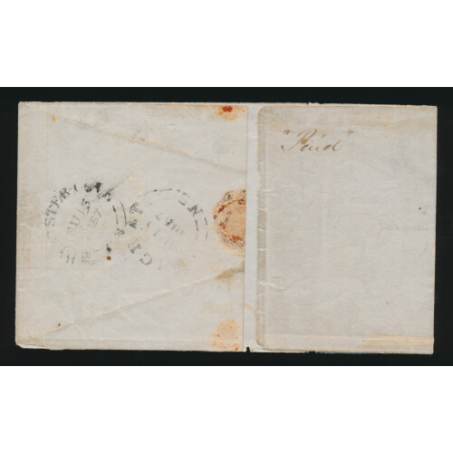 Nova Scotia: 1857 6d Yellow Green on Cut Down Folded Cover to Arichat, with a nice 4 margin stamp, tied to cover by an oval grid cancel, with Arichat and Plaister Cove backstops. The folded cover is cut-down and has a vertical file fold at left, plus some minor staining otherwise attractive franking. SG 5 Cat on cover £2700.