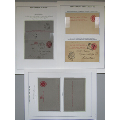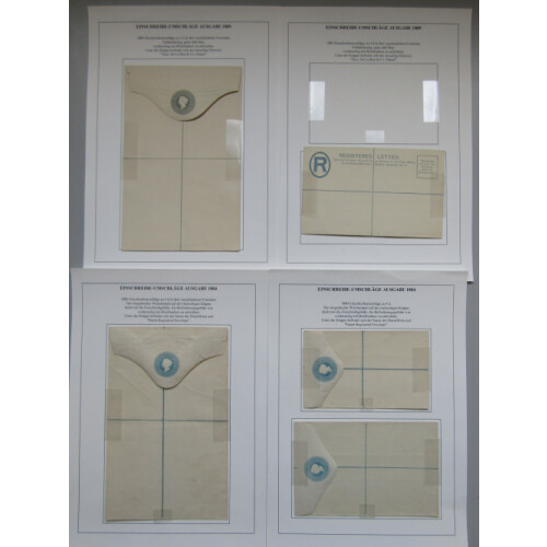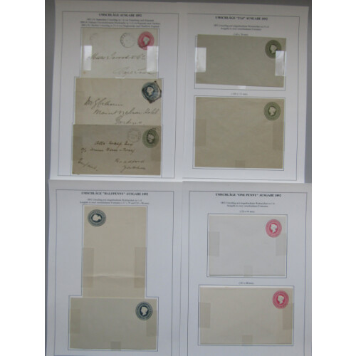 Postal Stationery: Queen Victoria collection on leaves mint and used. Useful used items including 1893 Registered envelope CLAREMONT to Switzerland uprated with 2d green Sitting Hope and 1892-6 envelopes to 2d (3), mint includes 1884 4d blue large registered envelopes (3, two diff sizes). An extremely useful lot in VERY FINE condition (25)