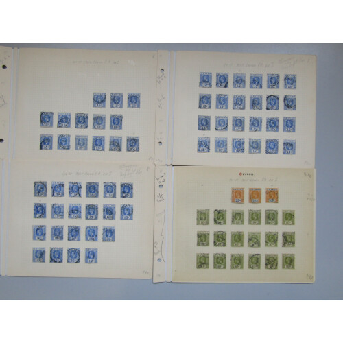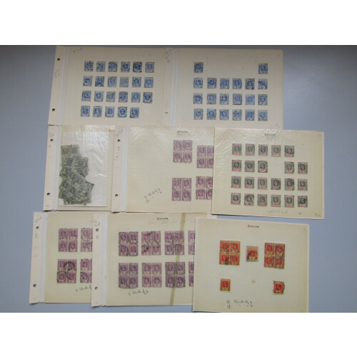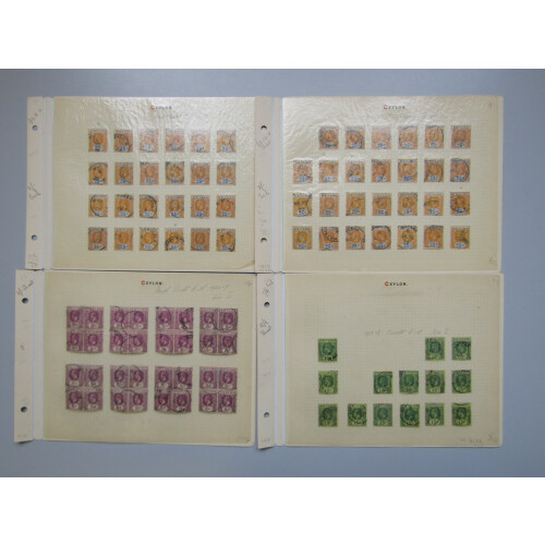 1912-25 Duplicated accumulation of GV defins on album pages all used with many CDS cancellations with town and village cancellations. Includes 5c bright magenta in blocks of 4 with NALANDA and RAMBODA CDS's then 10c (80), 15c (57), 25c (54); 1921 5c in blocks of 4, 1923 15c (14), 20c Die 1 (43, cat £20 each), 6c in blocks of 4, 9c, 50c Die II (22), etc,.. Good specialist lot STC £1350
