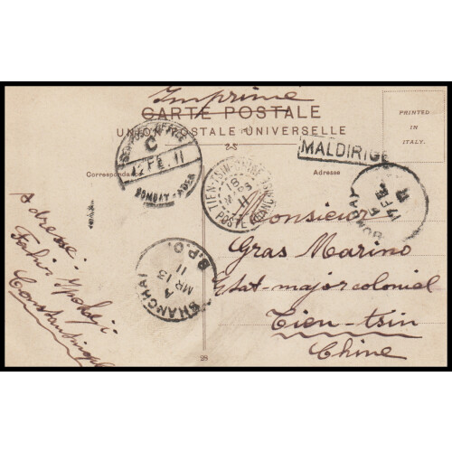 1911 Incoming postcard from Istanbul The Mosque of St Sophie bearing 10p green tied on obverse by Stamboul cds, addressed to Tientsin sent via SEA POST OFFICE BOMBAY - ADEN cds, and BOMBAY cds with boxed MALDIRIGE denoting miss-sorted to Bombay in error with Shanghai BPO transit and Tien-tsin arrival cds. few marks otherwise fascinating postcard. Late use of the Indian Maldirige recorded in 1893 onwards.