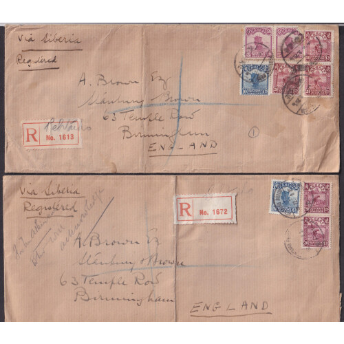 1920s Pehtaiho Beach; Four Registered covers from same correspondence addressed to England bearing various Junk or Farmer defins tied bilingual PEHTAIHO BEACH CDS cancels, manuscript pencil Pehtaiho on each blank registered label sent via Siberia. Each cover has vertical folds and postal creases, scarce group of four items.