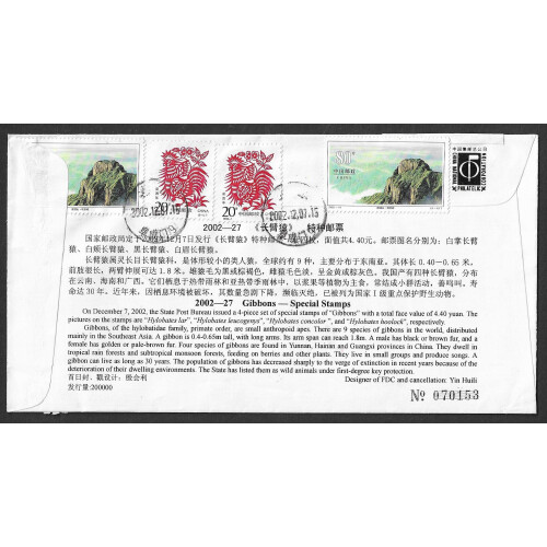 2002 Illustrated typed December 7th cover from Beijing with set of four Gibbons in forests to Germany. SG 4776-4779.