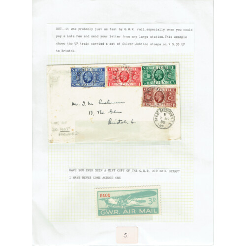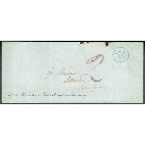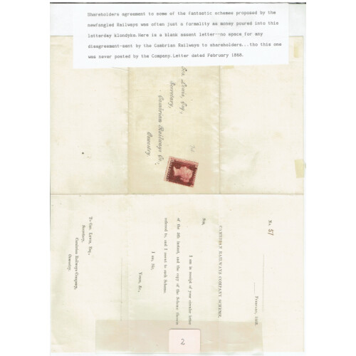 RAILWAY Covers 1849-1953, useful little group including 1849 Oxford, Worcester & Wolverhampton with manuscript '2' in red to Evesham, 1880 London paid to Gloucester Station, 1853 London and North Western Railway printed env. Birmingham to Dudley, 1868 Cambrian Railways Co. Scheme assent form with mint 1d plate 74 affixed but form unused. 1879 GWR Parcels Way-Bill Audlem to Longsight alongwith mint 2d black on blue label not yet affixed, 1934 printed Railway Air Services one London to Glasgow, second Plymouth to Cardiff. 1933 GWR label tied to cover Plymouth North Road purple d/s to Ipswich. 1935 Silver Jubilee set used on 1st day by GREAT WESTERN TPO cds (tones), useful group. (10).