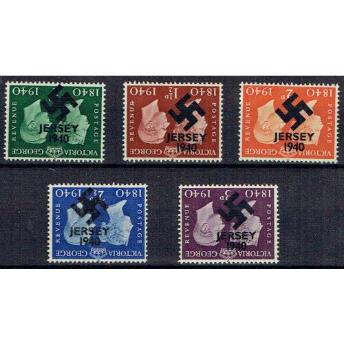 1940 Stamp Centenary five values mint each with forged overprints of Swastika & 1940 INVERTED in black, fine. (5 values, 1d was not overprinted).