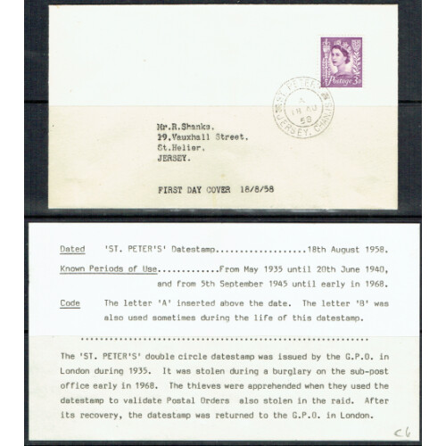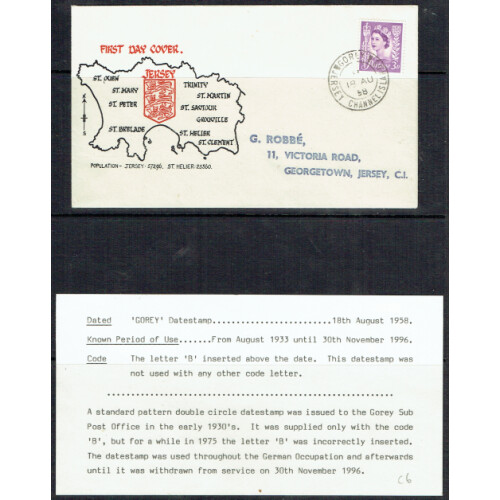 1958 Regional: 3d deep lilac x 6 different first day covers each with different sub post office cancel, written up on each stockpage cancelled at St Martin's, Gorey, St John's Church, La Rocque, St Peters nice illus covers. (6).
