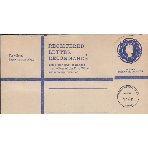 Registered postal stationery envelopes large and medium sizes with uprated cancels 1975 CTO including K size Uprated 6p & 12½p in violet (2), Official uprated 28½p plus 11½p, G Size uprated 17½p on 22½p (2), plus 3 ordinary unused. Fine (8).
