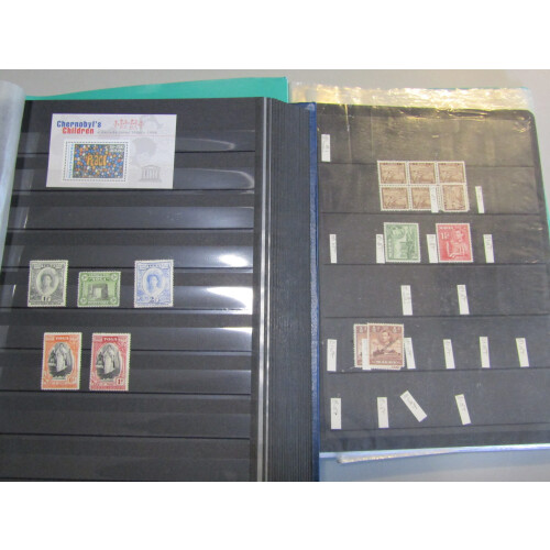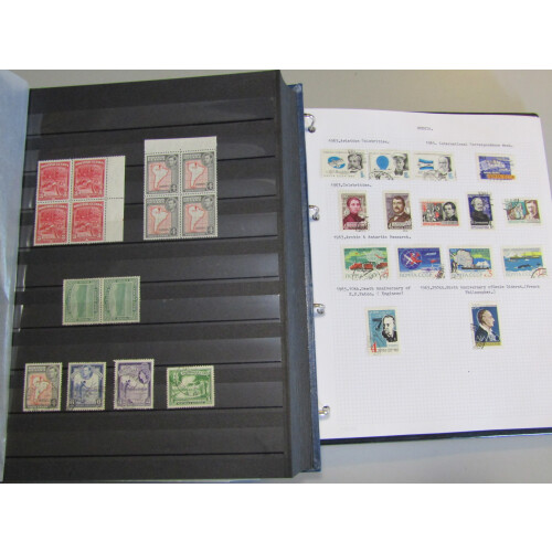 Carton containing 7 albums/stockbooks/binders of material including 64pp stockbook with sparce ranges of mint S. Africa and Commonwealth, Jersey, Australia, album of 1960's Russia plus a 2022 SG British Commonwealth catalogue with spine split. Worth a look.