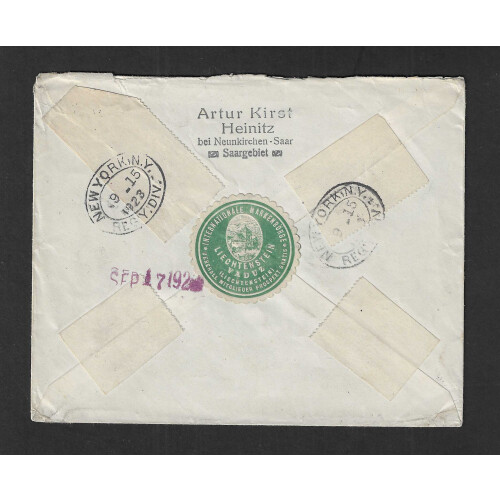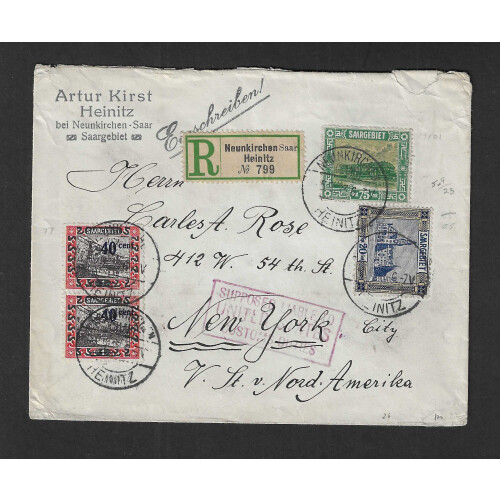 1922 League of Nations in French Currency registered envelope Neunkirchen Heinitz to New York with a nice combination including 75c green and yellow (Michel €80 on cover) with embossed green and white Liechtenstein Vaduz label affixed on reverse, with USA arrival backstamps and SUPPOSED LIABLE TO / UNITED STATES / CUSTOMS DUTIES boxed h/s on obverse, slightly worn but unusual cover.
