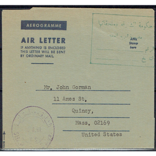 1964 Formular aerogramme to USA used with boxed Arabic cancel and violet bilingual cds in bottom left. Very fine.