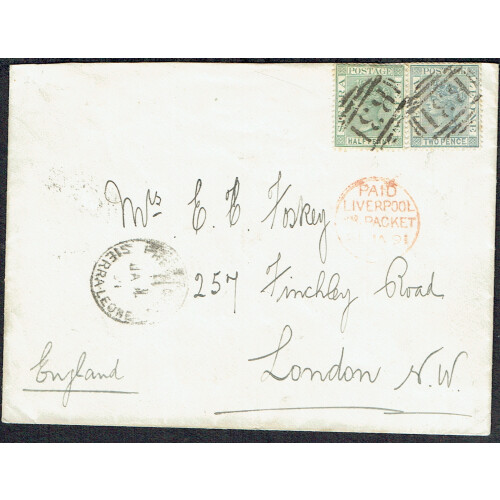 1891 ½d green and 2d grey tied to commercial cover to London cancelled B31 numeral cancels with smudged Freetown cds alongside, nice PAID / LIVERPOOL Br. PACKET cds in red on obverse.