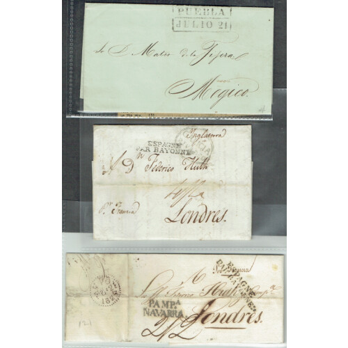 Nine prestamp covers each with nice single line framed and unframed cancels noted 1847 E.L London to Bilbao sent via France with various chargemarks handstamped or manuscript, Minores single line in blue, fancy CADIZ 12r to Alicante, 1816 Galicia fancy oval in black to London with ESPAGNE / PAR BAYONNE French h/s in black with double ring FOREIGN cds on reverse, 1825 Pampalona, Navarra to London 1842 PUEBLA, 1850 SAIN ALTO with 4 charge h/s applied twice, once over a 3 chargemark, 1843 ZACATECAS (2). Nice group (9).