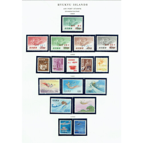 Ryukyu Islands: Airmails Mainly unmounted mint collection of sets and ranges on Scott printed leaves includes 1950 set 3 (Scott $167), 1951-4 set, 1957 set (Scott $67), 1959 surch set, 1960 surcharge set, others to 1963. (30).